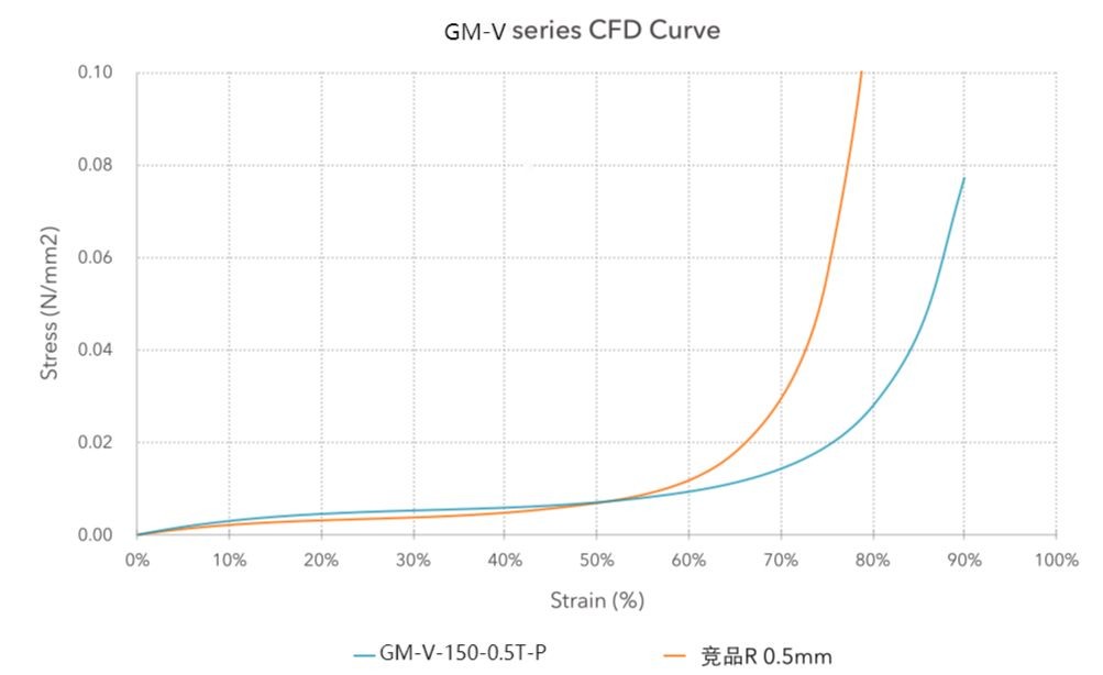 以上压缩曲线对比可以看出GM-V材料在50%以内的压缩空间里表现基本和竞品R 0.5mm(密度104kg/m3)的材料持平,反弹力数值上会略微大一些,但是在50%后面的压缩反弹力更小,具有更多可压缩的空间。在设备需要柔软材料保护的情况下可以提供优异的性能。GN-V材料表面强韧,非常容易搭配保护膜使用。不易破损,模切和装配更为洁净。