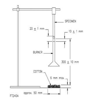 3)点火,时间为10±0.5s,点火10±0.5s 后以300mm/s 的速度移开本生灯至少150mm,同时开始,记录余焰时间t 1 (如果在此期间试样滴下熔融或燃烧的物质,倾斜喷灯最大至45°,避免熔融的物质滴入喷火管中),余焰停止时应立即点燃10±0.5s,点火10±0.5s后以300mm/s的速度移开,本生灯至少移开150mm,同时记录余焰时间t 2 和余灼时间t 3 。