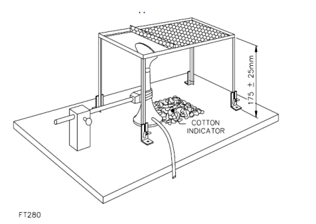 b) 搭建装置,如右图所示,整个支架为175±25mm,本生灯灯尖离样品的距离为13±1mm,在铁丝网水平面正下方底部放置50mm×50mm,不超过6mm厚的吸水脱脂棉;